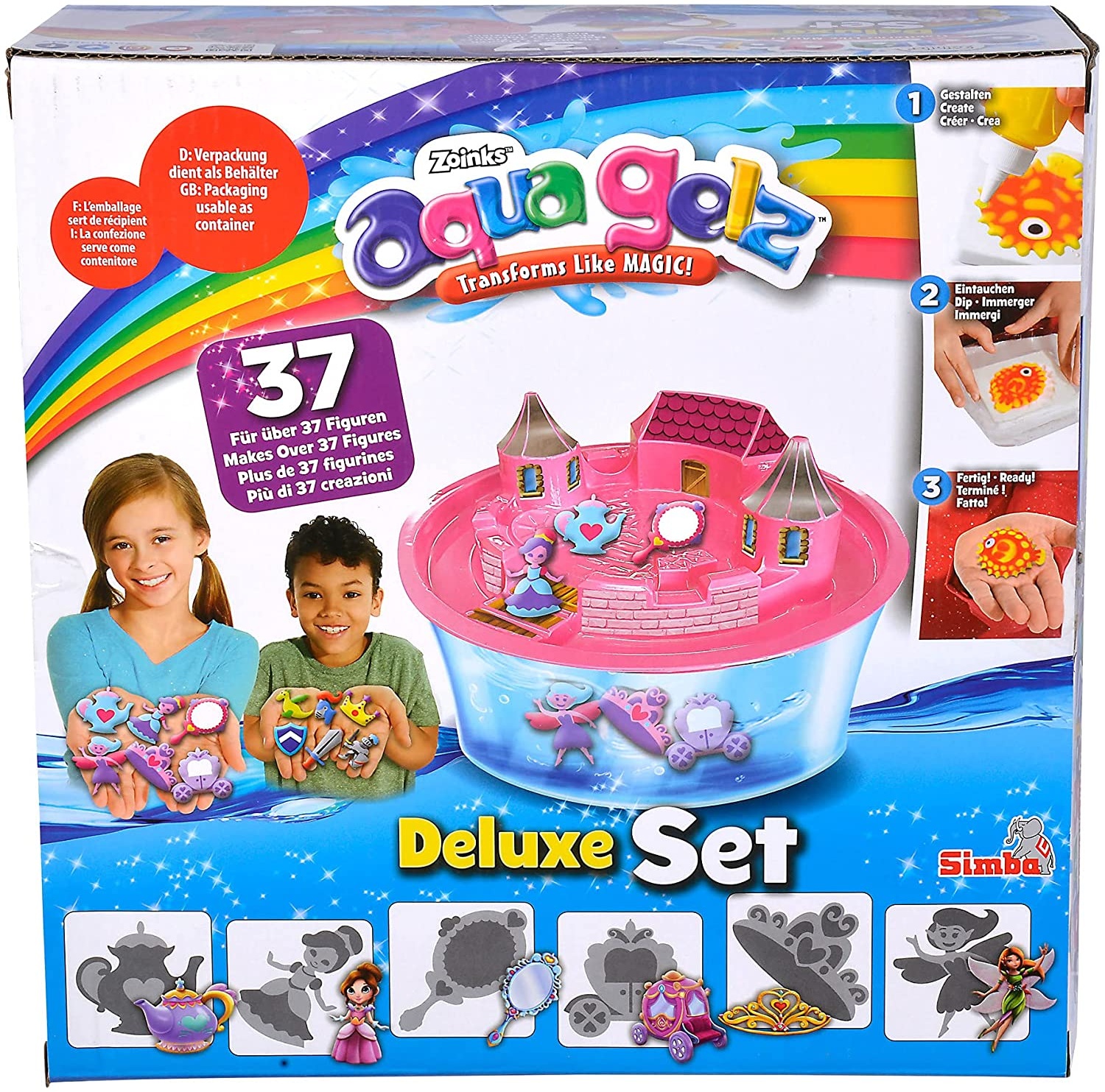 • Einzigartige Figuren: Mit den Aqua Gelz entstehen auf magische Weise einzigartige Soft Figuren in 3D. Kinder können ihrer Kreativität bei der Gestaltung freien Lauf lassen. • Einfache Anwendung: Man gibt die verschiedenen Farbgele nach Belieben in die enthaltenen Formen und taucht diese anschließend in das Wasserbad. Innerhalb von Sekunden verwandelt sich das Gel von einem flachen Motiv in eine tolle 3D Figur. • Mit Prinzessinnen Schloss: in dem Set ist eine große Schale enthalten, auf welche der rosa Deckel mit Prinzessinnenschloss aufgesteckt werden kann. Kinder können ihre Figuren unten im Wasser schwimmen lassen oder mit ihnen auf dem Schloss spielen. • Umfangreicher Inhalt: Das Set beinhaltet 8 Flaschen buntes Farbgel sowie eine große Schale mit Schloss Aufsatz und Stickern, 6 Formen und 5x Wasserzusatz. Kinder können ihre Figuren farblich individuell gestalten und anschließend damit spielen. • Simba - Elefantenstarker Spielspaß! Im Zentrum der Produktentwicklung steht die Begeisterung der Kinder. Für Jungen und Mädchen, Klein und Groß. Kinder sollen Spaß haben und gefördert werden.