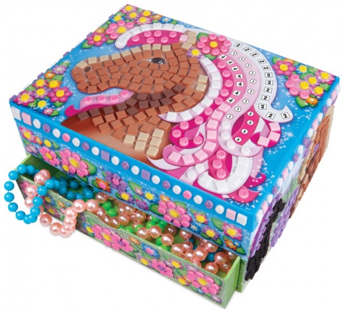 Das schmuckkästchen klebrige Mosaike Pferd Junior blau erfreut viele Kunden, besonders Kinder, mit seinem süßen Design und der Möglichkeit, Schmuck und kleine Schätze zu verstauen. Es bietet eine gute Bastelmöglichkeit und fördert die Motorik und Konzentration.