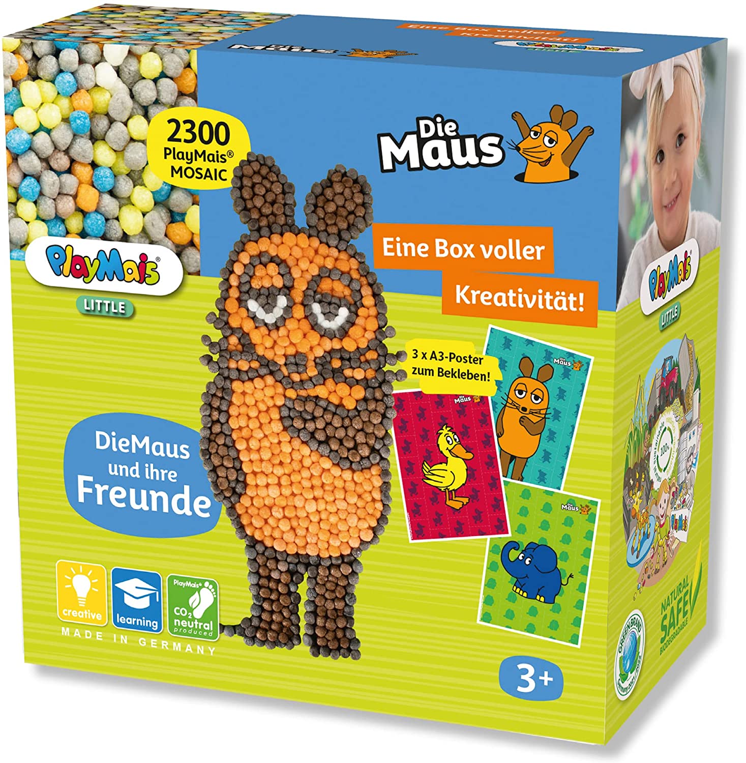 | Beschreibung | Diese Box enthält ca. 2. 300 Play Mais® MOSAIC, einen Schwamm, 3 Poster A3 mit Motiven von Die Maus und eine Anleitung mit vielen Anregungen zum nachbasteln. |
