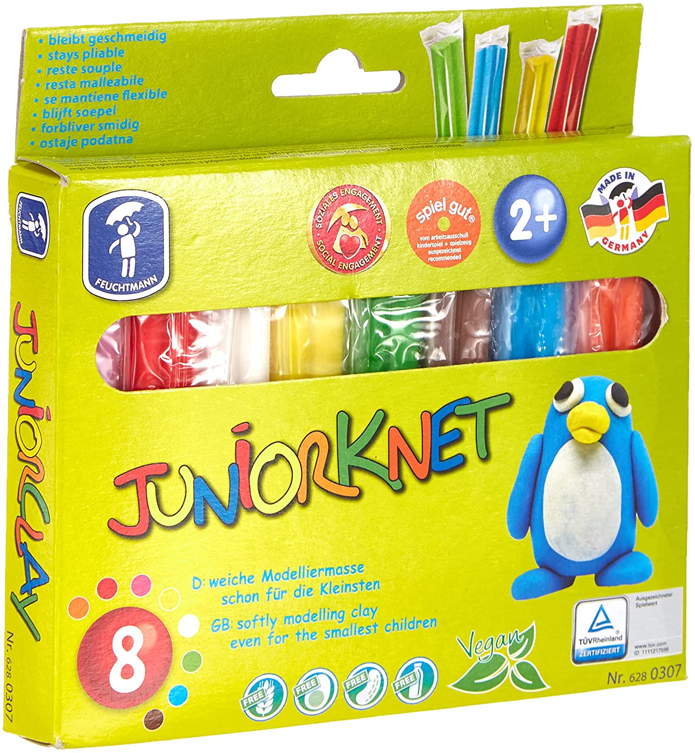 Die Feuchtmann Juniorknet ist eine schadstofffreie Knete aus natürlicher Kartoffelstärke, die angenehm riecht und lange formbar bleibt. Sie eignet sich gut zum Modellieren und Mischen von Farben. Allerdings klebt sie stark an Händen und Unterlagen, ist schwer abwaschbar und es fehlen einige Farbvarianten.