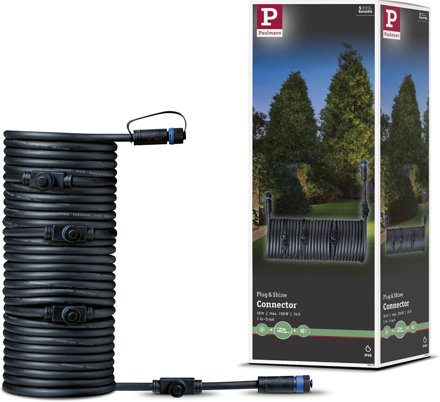 Beschreibung Das Paulmann Beleuchtungssystem Plug&Shine 5fach-Verteiler 93930 in Schwarz ist ein vielseitiges 24V-Verbindungskabel mit IP68-Schutz, das gegen dauerhaftes Untertauchen geschützt ist. Es ermöglicht den Anschluss von bis zu fünf weiteren Leuchten oder Zubehörteilen und überbrückt Entfernungen bis zu 10 m. Ideal für die individuelle Gestaltung Ihres Außenbereichs, ist es sowohl ober- als auch unterirdisch verlegbar. **Highlights** - 24V-Verbindungskabel für flexible Beleuchtungslösungen - IP68-Schutz für dauerhaften Einsatz im Freien - Kombinierbar mit allen Leuchten und Zubehörteilen der Plug&Shine Serie - Ober- und unterirdisch verlegbar für vielseitige Anwendung - Fünf Anschlussbuchsen für zusätzlichen Zubehöranschluss **Produkteigenschaften** - Länge: 10 m - Max. Leistung: max. 150 W - Farbe: Schwarz - Material: Kunststoff - Schutzklasse: III - Technik: Zubehör ohne Lichtquelle **Lieferumfang** - 1 x Plug&Shine Verbindungskabel mit fünf Anschlussbuchsen - Abdeckkappen für nicht benötigte Abgänge