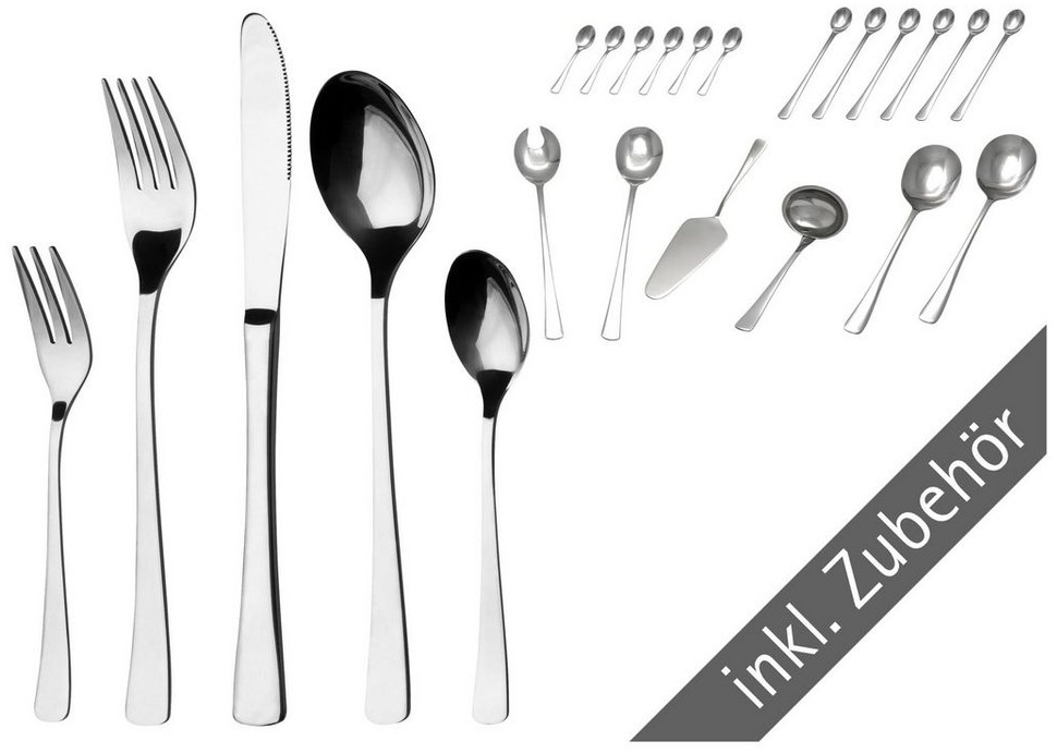| Lieferumfang | 6x Tafelmesser, 6x Tafelgabel, 6x Tafellöffel, 6x Kaffeelöffel, 6x Kuchengabel, 6x Espressolöffel, 6x Longdrinklöffel, 2x Servierlöffel, 1x Tortenheber, 1x Saucenlöffel, 2x Salatbesteck (Salatlöffel + Salatgabel) |