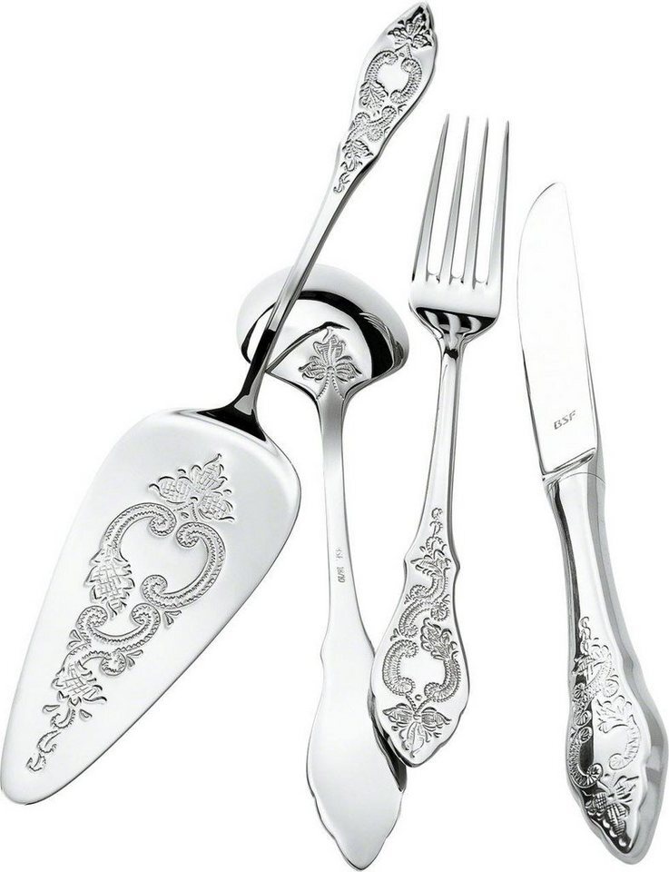 | Lieferumfang | 12x Menümesser, 12x Menügabel, 12x Menülöffel, 12x Teelöffel, 12x Kuchengabel, 1x Suppen-/Sahnelöffel, 1x Tortenheber, 2x Fleischgabel, 1x Saucenlöffel, 1x Zuckerlöffel, 2x Salat-/Kompottlöffel |