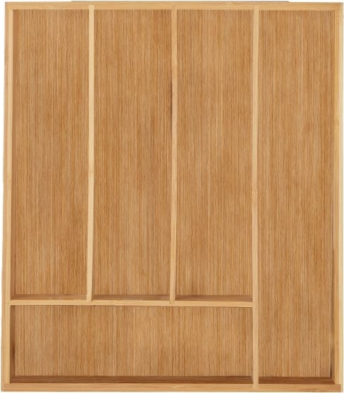 2 x Besteckkasten Bambus mit 5 Fächern. Dieser praktische Besteckeinsatz sorgt für Ordnung in Ihrer Küche und eignet sich auch für Schreibtischutensilien oder Bastelbedarf. Die robuste Konstruktion aus Bambus in natürlicher Optik passt ideal in kleine bis mittelgroße Schubladen. Die Reinigung erfolgt einfach mit einem feuchten Lappen. **Highlights** - 5 Fächer für Gabeln, Löffel und andere Küchenutensilien - Für mehr Ordnung und Übersichtlichkeit in der Schublade - Auch für Nähbedarf, Schreibtischutensilien uvm. - Stabiles Design aus Bambus in natürlicher Optik - Kompakter Einsatz - Passt auch in kleine Schubladen **Produkteigenschaften** - Gesamtmaße H x B x T: ca. 5 x 30 x 34 cm - Maße kleinere Längsfächer H x B x T: ca. 4,5 x 6,5 x 25 cm - Maße großes Längsfach H x B x T: ca. 4,5 x 6,5 x 32,5 cm - Maße Querfach H x B x T: ca. 4,5 x 21 x 6,5 cm - Gewicht: ca. 700 g - Material: Bambus, MDF - Farbe: Natur - Im 2er Set **Lieferumfang** - 2 x Besteckschubladeneinsatz - Dekoartikel sind nicht im Lieferumfang enthalten