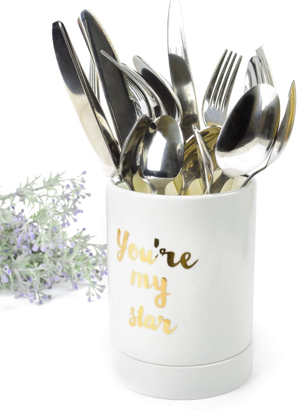 Handgemachter Besteckhalter mit Abtropfständer aus Porzellan. Mit einer Höhe von ca. 14,5 cm und einem Durchmesser von ca. 10,5 cm bietet er Platz für Besteck, Servietten und Wattepads. Die dekorative Beschriftung "You're my star" macht ihn zu einem besonderen Hingucker. Ideal für den Hausgebrauch und die Gastronomie, kommt er in einer ansprechenden Geschenk-Box. **Highlights** - Handgemacht aus Porzellan - Höhe ca. 14,5 cm - Durchmesser ca. 10,5 cm - Mit Beschriftung: "You're my star" - Inkl. Geschenk-Box **Produkteigenschaften** - Bestens geeignet zum Aufbahren von Besteck, Servietten, Wattepads - Platzsparend und dekorativ - Reine Handarbeit - Ein Hingucker der besonderen Art - Ideal für den Hausgebrauch und die Gastronomie **Lieferumfang** - Besteckhalter mit Abtropfständer aus Porzellan