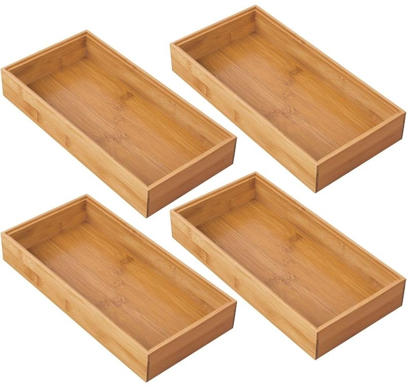 Die mDesign Aufbewahrungsbox im 4er Set bietet eine praktische Lösung zur Organisation Ihrer Küche. Diese vielseitigen Schubladenboxen aus robustem Bambus sind ideal zur Aufbewahrung von Besteck, Spateln und anderen Küchenutensilien. Mit einer natürlichen hellbraunen Farbe und kompakten Maßen von 15,2 x 5,1 x 5,1 cm sind sie nicht nur funktional, sondern auch umweltfreundlich. Sie können auch im Badezimmer zur Aufbewahrung von Kosmetika verwendet werden. **Highlights** - 4er Set für optimale Ordnung in der Küche - Vielseitig einsetzbar als Schubladenorganizer - Hergestellt aus robustem und umweltfreundlichem Bambus - Hohe Widerstandsfähigkeit gegen Flecken und Bakterien - Leicht zu reinigen mit mildem Seifenwasser **Produkteigenschaften** - Material: Holz Bambus - Farbe: Hellbraun (natürlich) - Maße: 15,2 x 5,1 x 5,1 cm - Anzahl der Teile: 4 Stück **Lieferumfang** - 4x Bambus Schubladeneinsätze - Hinweis: Farben können je nach Monitoreinstellung abweichen.