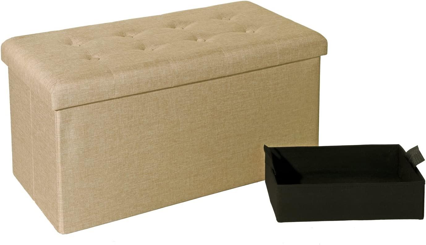 Bezug aus robusten Leinen in einem eleganten Beige Gepolsterter und getufteter Deckel bietet Komfort und Stil Herausnehmbarer Innenbehälter zum Ordnen kleinerer Gegenstände Durchgehend solide MDF-Konstruktion mit abnehmbarem Oberteil; max. Belastbarkeit 225 kg Klappt sich problemlos auf beim Aufstellen; Kein Werkzeug erforderlich