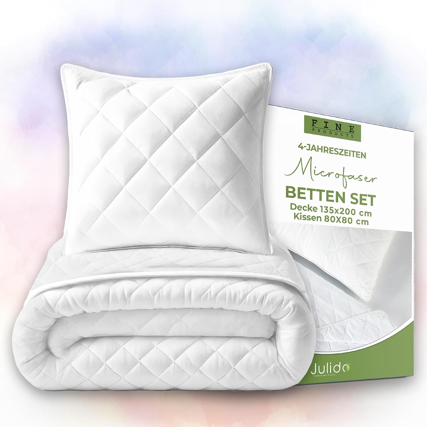 | Name | Julido 4-Jahreszeiten Komplettset Decke 135x200 cm Kissen 80x80 cm Deckenfüllung 550+800g Kissenfüllung 1000g Steppbett mit Druckknöpfen Ganzjahres-Bett Zudecke Kopfkissen |