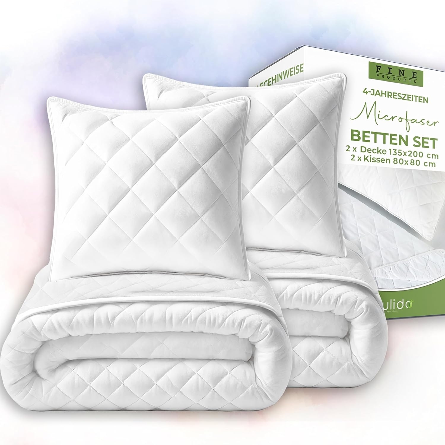| Name | Julido 4-Jahreszeiten Komplettset 2xDecke 135x200 cm 2xKissen 80x80 cm Deckenfüllung 550+800g Kissenfüllung 1000g Steppbett mit Druckknöpfen Ganzjahres-Bett Zudecke Kopfkissen |