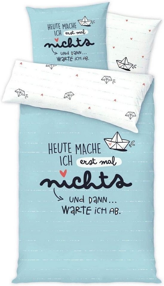 Die 2-teilige Bettwäsche Garnitur "Heute" von Sheepworld bringt frischen Wind in Ihr Schlafzimmer. Sie besteht aus einem Bettbezug (135 cm x 200 cm) und einem Kissenbezug (80 cm x 80 cm) aus 100% Mikrofaser (Polyester). Das Wende-Motiv zeigt auf der Vorderseite ein maritimes Design mit dem Spruch "Heute mache ich erst mal nichts" und ist auf der Rückseite in Weiß gehalten. Die Bettwäsche ist bei 40 Grad waschbar und lässt sich dank Reißverschluss bequem an- und abziehen. **Highlights** - Wende-Motiv mit maritimem Druck und frechem Spruch - Waschbar bei 40 Grad für einfache Pflege - Praktischer Reißverschluss für leichtes An- und Abziehen - Trendiges Design, das als Geschenk ideal geeignet ist - Hergestellt von der Traditionsmarke Sheepworld AG **Produkteigenschaften** - Maße Bettbezug: 135 cm x 200 cm - Maße Kissenbezug: 80 cm x 80 cm - Material: 100% Polyester (Mikrofaser) - Vorderseite mit Schiffchen-Motiv und Spruch - Rückseite in Weiß mit Schiffchen Wendemotiv **Lieferumfang** - 1 x Bettbezug (135 cm x 200 cm) - 1 x Kissenbezug (80 cm x 80 cm)