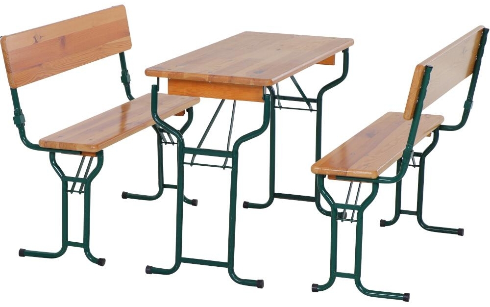 Beschreibung Die Festzeltgarnitur 110 cm mit Rückenlehne ist eine praktische und stilvolle Lösung für Ihre Veranstaltungen. Sie besteht aus einem Tisch und zwei Bänken, die aus klar lackiertem Kiefernholz gefertigt sind. Das pulverbeschichtete Stahlgestell in grün sorgt für Stabilität und Langlebigkeit. Mit einer Sitzhöhe von 50 cm und einer maximalen Belastbarkeit von 220 kg ist diese Garnitur ideal für gesellige Zusammenkünfte. **Highlights** - 3-teiliges Set bestehend aus 1 Tisch und 2 Bänken mit Rückenlehne - Flächen und Tischplatte aus klar lackiertem Kiefernholz in natur - Gestell aus pulverbeschichtetem Stahl in grün - Sitzhöhe von 50 cm für optimalen Komfort - Maximale Belastbarkeit von 220 kg **Produkteigenschaften** - Maße Tisch: 110 x 50 x 79 cm - Maße Bank: 110 x 37 x 87 cm - Gewicht Tisch: 12,6 kg - Gewicht Bank: 12,7 kg **Lieferumfang** - 1 Tisch - 2 Bänke mit Rückenlehne