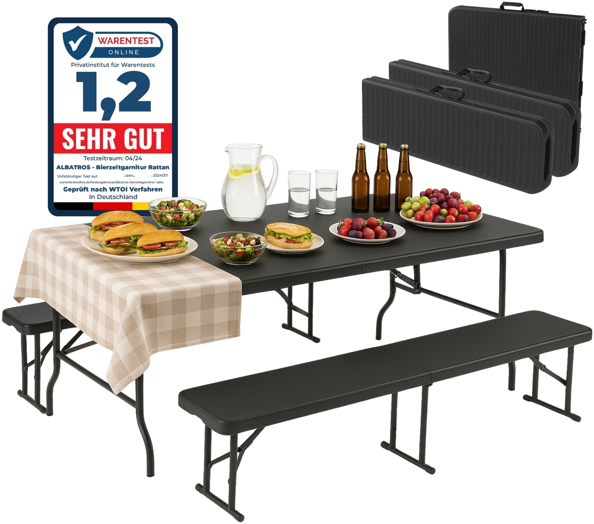 | Name | Albatros Bierzeltgarnitur Rattan – robuste Biertischgarnitur Klappbar und hohe Tragkraft – Set aus 2x Bierbank und 1x Biertisch für bis zu 10 Personen – Bierbankgarnitur |