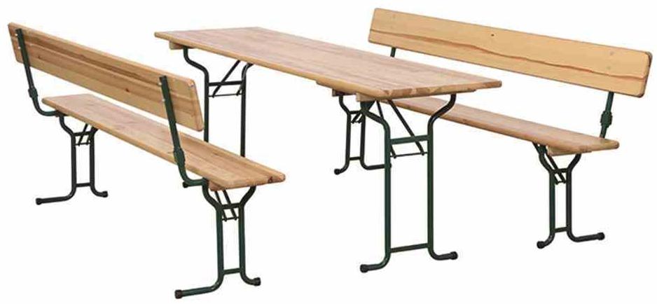 | Beschreibung | Festzeltgarnitur Biermöbel, 3 tlg, Gestell Stahl pulverbeschichtet in grün, Flächen und Tischplatte aus Kiefernholz klar lackiert in natur, mit Rückenlehne, 220 cm Breite |