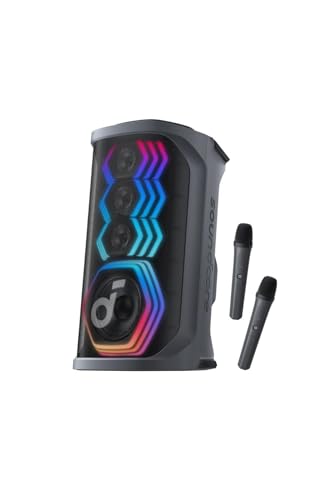 Lichtshow mit Sternenlichtern, coolen Lichtspuren und Stroboskop-Effekten, KI-Sound-Boost, Multi-Speaker-Konnektivität, Karaoke-EQ-Abstimmung.