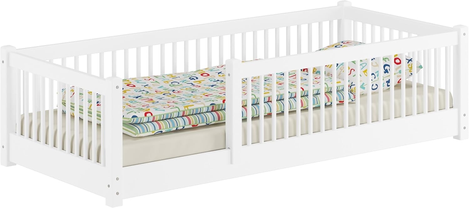 **Schönes niedriges Bodenbett für Kleinkinder.** **Kiefer massiv, weiß lackiert, Wasserlack** Tauchen Sie ein in die Welt des sicheren und behaglichen Schlafs für Ihr Kleinkind mit unserem niedrigen Kinderbett aus Kiefer weiß lackiert! Dieses vielseitige Möbelstück vereint die Funktionalität eines Babybetts mit der Freiheit eines Bodenbetts und erinnert an die Sicherheit eines Laufstalls, eine perfekte Kombination für das ultimative Kinderzimmer-Erlebnis. Liegefläche 90x200 cm **Zubehör wählbar:** - ohne Zubehör \*\*Naturprodukt Holz... logisch! Beschreibung:\*\* Unser Bett ist nicht nur ein Ort zum Schlafen, sondern auch zum Träumen, Spielen und Erkunden. Die niedrige Höhe von 14 cm macht es einfach für Ihr Kind, sicher ein- und auszusteigen, während die großzügige Einlegetiefe von 9 cm genügend Raum für eine komfortable Matratze bietet, die für einen erholsamen Schlaf sorgt. Die robusten Pfosten mit einer Größe von 5x5 cm garantieren Stabilität und Sicherheit, damit Sie beruhigt sein können, während Ihr kleiner Entdecker die Welt um sich herum erkundet. Die Bettumrandung bietet zusätzlichen Schutz vor dem Herausfallen und schafft eine gemütliche Schlafumgebung, in der sich Ihr Kind geborgen fühlt. Dieses Gitterbett ist nicht nur funktional, sondern auch ästhetisch ansprechend und fügt sich nahtlos in jedes Kinderzimmerdekor ein. Die natürliche Schönheit des Kiefernholzes verleiht dem Raum eine warme und einladende Atmosphäre, die zum Entspannen und Spielen einlädt. Entdecken Sie die Freude und den Frieden, den unser niedriges Kinderbett aus weiß lackierter Kiefer Ihrem Kind bietet. Schenken Sie ihm einen Ort, an dem es sich sicher und geborgen fühlt - ein Ort voller Liebe, Fantasie und Abenteuer. Genießen Sie die perfekte Kombination aus Ästhetik und Umweltbewusstsein mit unseren mit Wasserlack lackierten Produkten. **Maße:** Liegefläche: 90x200 cm Außenmaß: ca. 97,5x207 cm Höhe Bettkante: ca. 14 cm (Sitzhöhe) Höhe Bett: ca. 50 cm Einlegetiefe: ca. 9 cm Bettpfosten: stabile 5x5 cm Bretter: ca. 2,3 cm dick Stäbe: ca. 1,8 cm dick Rollmatratze RG 25 Liegefläche: 90x200 cm Höhe ca. 150 mm Kernhöhe ca.140 mm Härtegrad H2 – mittel mit atmungsaktiver Faser versteppt Die Bilder zeigen Beispiele für mögliches Zubehör und entsprechen nicht dem Lieferumfang.