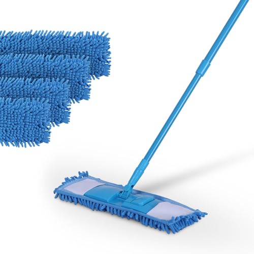 Bodenwischer Set ( Blau ) inkl. 4 Ersatzbezüge - Wischmopp mit Fußklick 360 Grad Gelenk für alle Ecken - Komfort Bodenreiniger Flachmopp Wischmopp