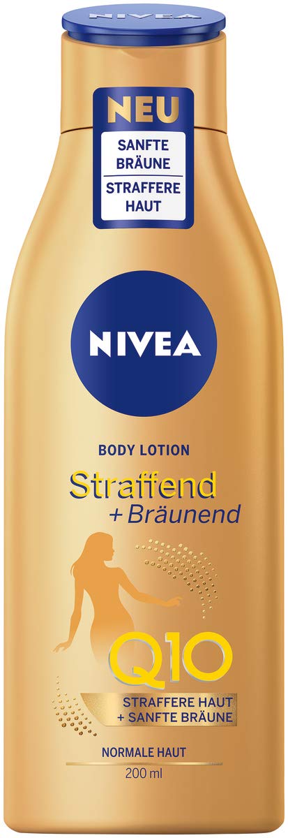 Die Nivea Body Lotion Straffend Bräunend Q10 bietet eine sanfte Bräune und straffende Anti-Age Hautpflege in einem Produkt. Dank des enthaltenen Q10 sorgt die Lotion nicht nur für einen guten Bräunungseffekt, sondern spendet der Haut auch Feuchtigkeit und hinterlässt einen frischen Sommerduft.