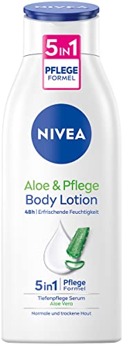 Die NIVEA Aloe & Pflege Body Lotion ist eine leicht einziehende Lotion, die die Haut intensiv mit Feuchtigkeit versorgt und ein seidiges Gefühl hinterlässt. Sie eignet sich besonders gut für trockene und empfindliche Haut und enthält Aloe Vera, die beruhigende Eigenschaften hat. Die Lotion hat einen dezenten, frischen Duft und ist ideal für die tägliche Anwendung.