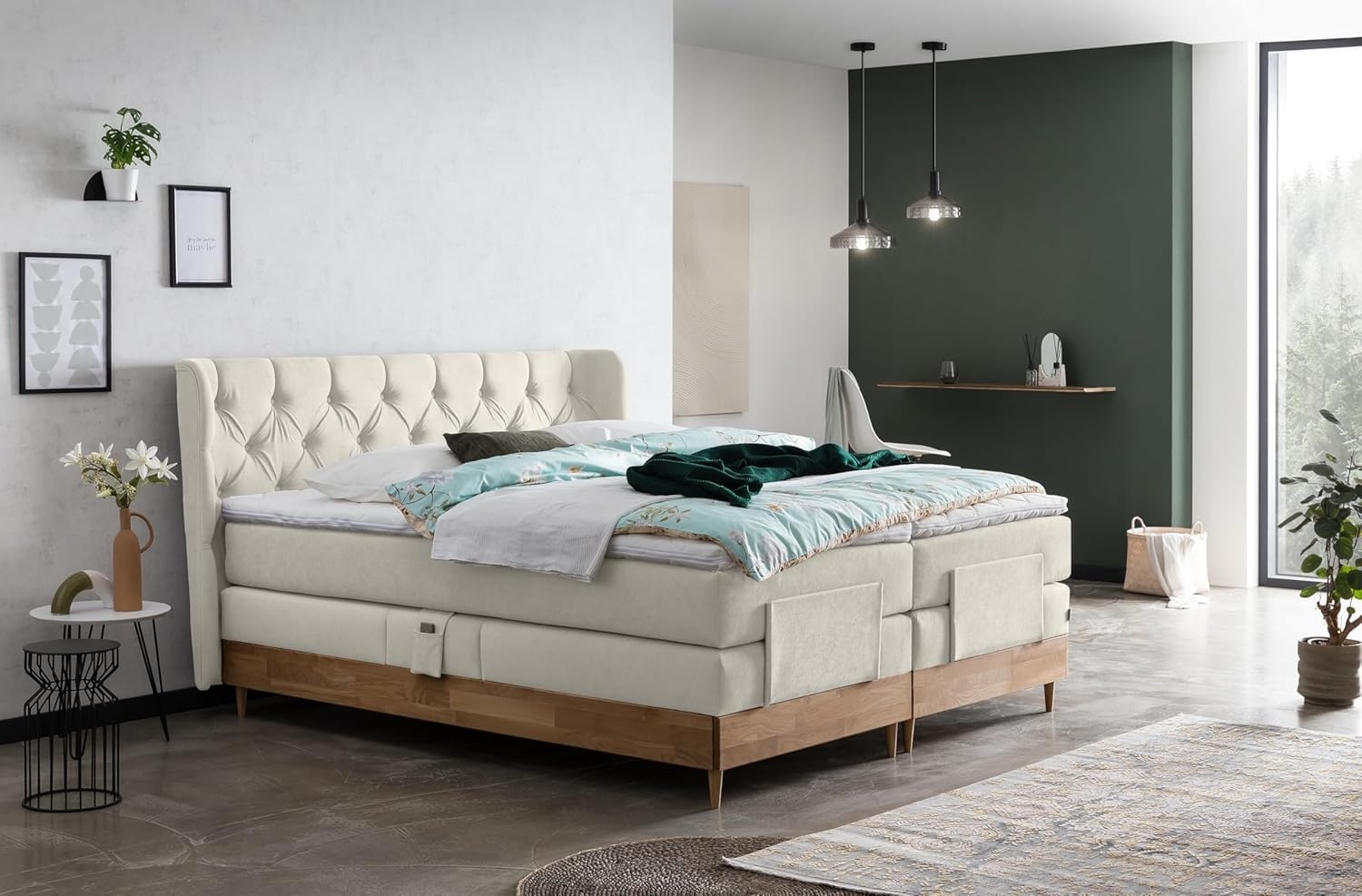 | Lieferumfang | 1x Boxspringbett, 1x Matratze, 2x Visco Topper, 2x Handschalter, 2x Lampen |