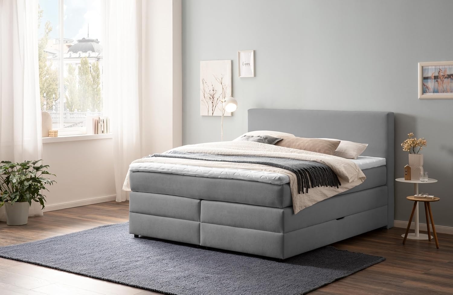 | Name | Belanoti Boxspringbett LOFT (Boxspringbett 160x200 mit Bettkasten, 7-Zonen Taschenfederkern Matratze inklusive Visco Topper), Bett 160x200 in der Farbe Hellgrau H2/H3 Polsterbett |