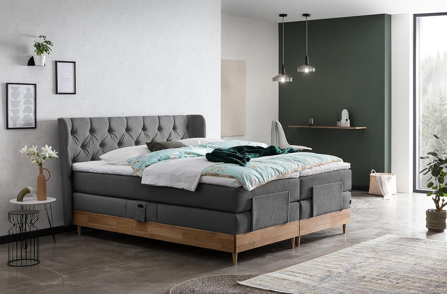 | Lieferumfang | 1x Boxspringbett, 1x Matratze, 2x Visco Topper, 2x Handschalter, 2x Lampen |