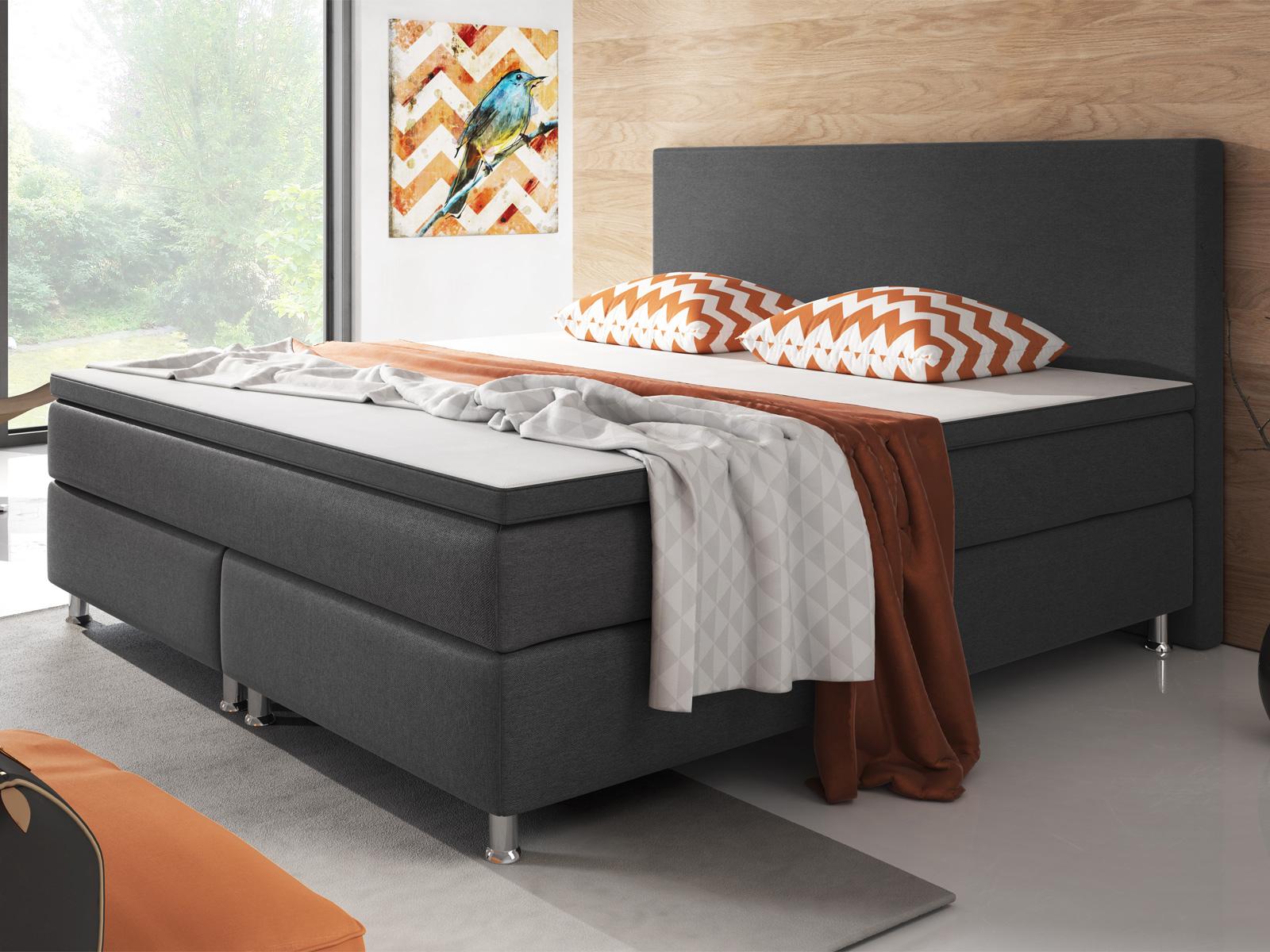 **Boxspringbett Berlin 180x200 Webstoff Anthrazit** Die Grundlage für dieses Boxspringsystem bildet ein Holzrundgestell mit Holzfaserplatten. Auf diesen Boxen liegen zwei 5 Gang Bonell-Federkern-Matratzen in einem durchgehenden Bezug. Durch die so erzeugte Federung entsteht ein einmaliger Federkomfort mit optimaler Körperanpassung und Druckentlastung. Den Abschluss eines wunderbaren Schlaferlebnisses bildet der PU-Schaum-Topper. Dieses Boxspringsystem ermöglicht einen hervorragenden Schlafkomfort durch sein exzellentes und individuelles Federungsverhalten. **Bestehend aus:** - Artikelnummer: 19009 - Boxspringbett Berlin - Untere Box: Holzrundgestell mit Holzfaserplatten - Obere Matratze: 5 Gang Bonell-Federkern-Matratze - PU-Schaum-Topper - Härtegrad: 3 (H3) **Maßen:** - Liegefläche: 180x200 cm - Breite des Kopfteils: 180 cm - Kopfteilstärke: 10 cm **Höhe:** - Kopfteil: 115 cm - Liegegestell: 60 cm - Box: 25 cm - Matratze: 20 cm / Federkern - Topper: 5 cm - Füße: 10 cm **Farbe:** - Korpusfarbe: Anthrazit - Bezug Korpus: Webstoff (100% Polyester) - Füße: silberfarbig Alle Maßen sind ca. Angaben in cm. Ohne Auflage, ohne Nachtkonsole, ohne Dekoration. Die Matratzen werden im gerollten Zustand geliefert. Matratzenbezug wird mitgeliefert und ist separat verpackt. Es kommen 2 Matratzenkerne in einem Matratzenbezug. Der Matratzenbezug ist unten an dem Topper drangenäht, die Matratzen müssen dort lediglich hineingeschoben werden. Die Lieferung erfolgt nur bis zur Bordsteinkante; die Ware wird vom Fahrer der Spedition nicht in die Wohnung bzw. ins Haus transportiert. . Pflegehinweis: das Bett nicht sofort nach dem Aufstehen abdecken. Nach Benutzung für gute Be-/Auslüftung sorgen, damit die aufgenommene - Feuchtigkeit wieder abgegeben werden kann. Um eine gleichmäßige Belastung zu garantieren, Topper und Matratze regelmäßig wenden, ca. alle 4 Wochen Topper kann zusätzlich ab und zu ausgeschüttelt werden