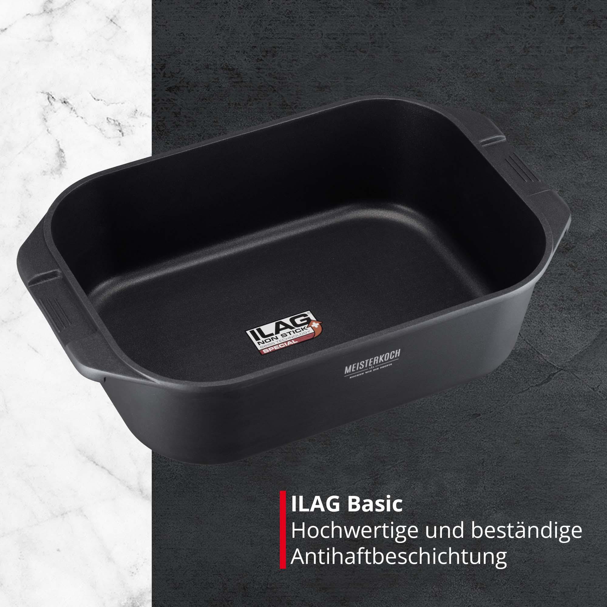 | Name | MEISTERKOCH Profi-Bräter 7,5 l mit Glasdeckel, eckig, schwarzer Alu-Guss, Induktion-geeignet mit Dämpfeinsatz, backofengeeignet bis 300°C, spülmaschinengeeignet, Bratenthermometer |