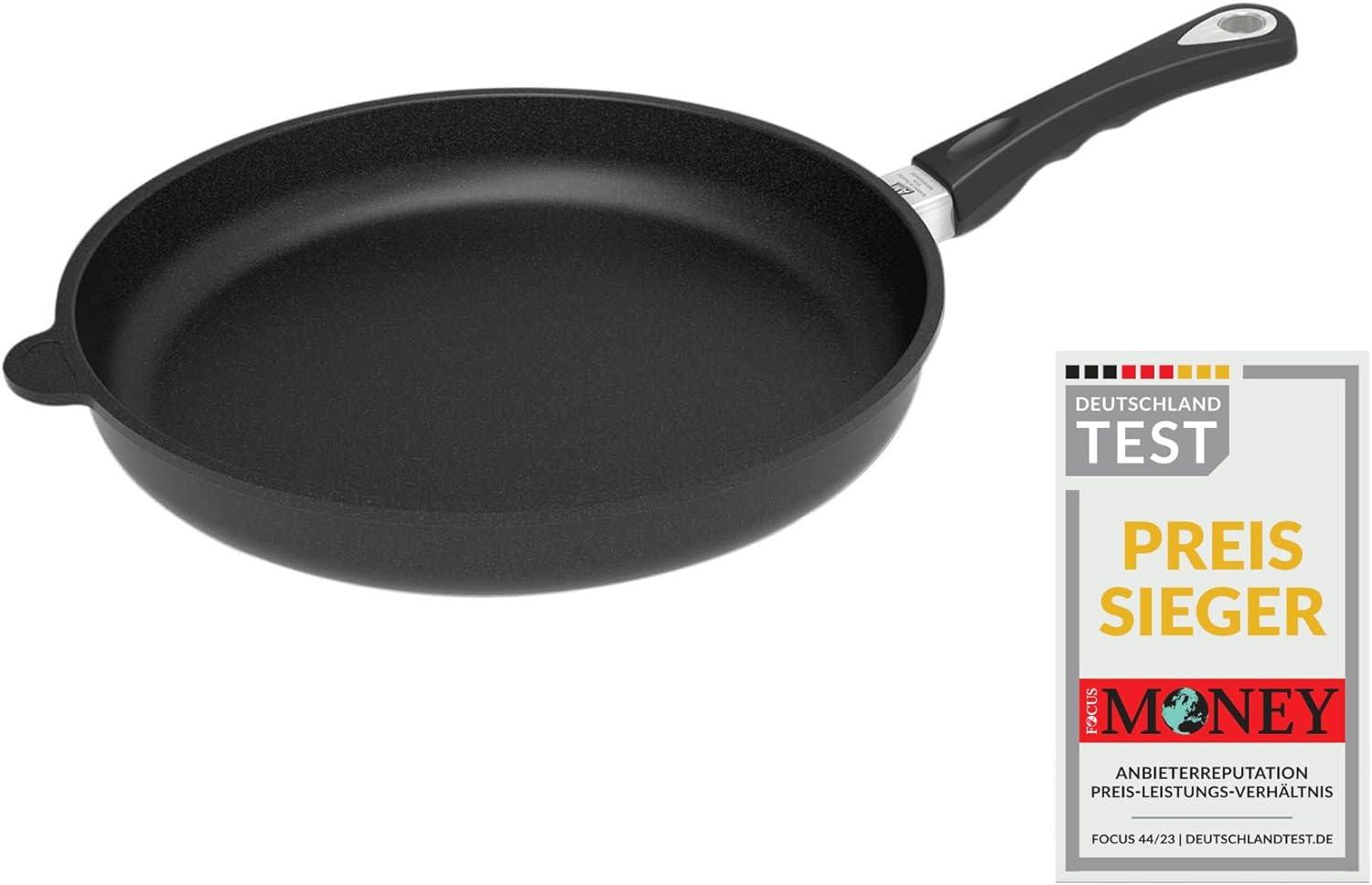 Die AMT I-432 Induktion Bratpfanne aus Aluminiumguss mit einem Durchmesser von 32 cm und einer Höhe von 4 cm ist für Induktionsherde geeignet. Der Alugusskörper ist mit einer Titanoxid-Plasmaschicht versehen, die Schnitt- und Kratzfestigkeit bietet. Die Pfanne verfügt über eine Topcoat-Antihaftbeschichtung und ist bis 240 °C backofenfest. Die Pfanne ist mit zahlreichen Auszeichnungen wie dem German Brand Award und dem German Design Award prämiert. Sie ist die offizielle Ausstattung der Deutschen Köche-Nationalmannschaft und wurde als Kücheninnovation des Jahres ausgezeichnet. Die Pfanne zeichnet sich durch ihre ausgezeichnete Qualität und Widerstandsfähigkeit aus. Mit einem Durchmesser von 32 cm bietet sie ausreichend Platz für verschiedene Gerichte. Der 4 cm hohe Rand und die spezielle Bodenkonstruktion sorgen für optimale Wärmeleitung und Wärmespeicherung. Die Pfanne ist vielseitig einsetzbar und leicht zu reinigen. Sie ist spülmaschinenfest und eignet sich für Ceran-, Elektro- und Gasherde. Die Pfanne ist ein unverzichtbares Küchenutensil für alle, die gerne kochen und Wert auf Qualität legen. **Highlights** - German Brand Award 16: Ausgezeichnete Qualität und Design - German Design Award Nominee 2016: Anerkennung für herausragendes Design - Offizieller Ausstatter der Deutschen Köche-Nationalmannschaft: Vertrauen der Profis - Kücheninnovation des Jahres 2012, 2013, 2014: Innovative Technologie für optimale Ergebnisse - Lotan®-Spezialversiegelung: Antihaftbeschichtung für fettarmes Braten **Produkteigenschaften** - Maße: ca. 32x4 cm (Øx H) - Material: Aluminium-Handguss - Wärmeisolierter Kunststoffgriff mit ergonomischen Griffmulden - Backofengeeignet bis 240°C - Farbe: Schwarz - Geeignet für Ceran-, Elektro- und Gasherd - Spülmaschinengeeignet - Durchmesser oben / Boden: 32 cm / 25 cm - Höhe: 4 cm - Inhalt: 2,5 L - Herdart: Gas- und Elektroherd, Ceran- und Halogenkochfeld, Induktion - Besonders dicker Boden (8-10 mm) für optimale Wärmeleitung und Speicherung - 4-fache Lotan-Oberflächenveredelung für mühelose Reinigung - Zusätzlich verstärkter Schüttrand