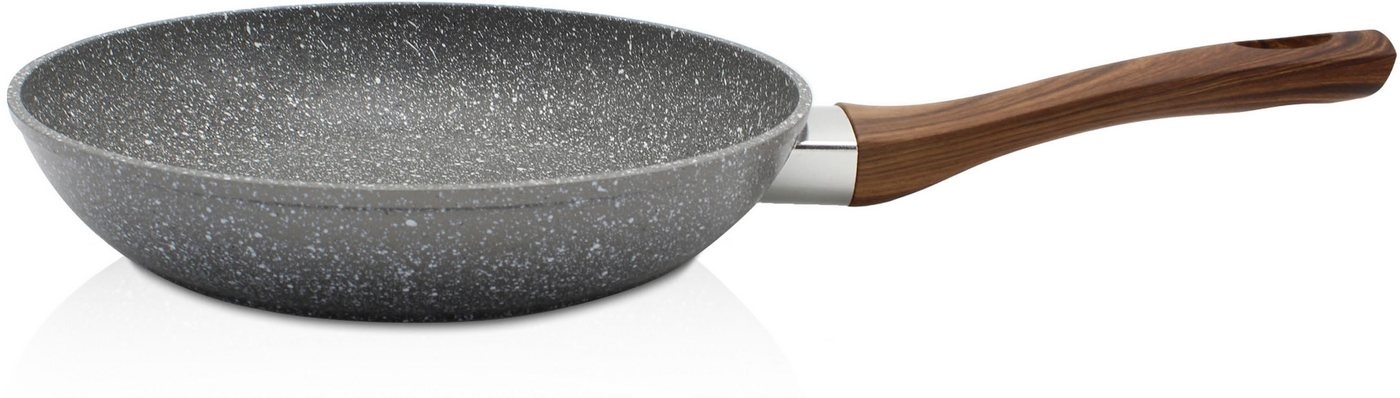 Die Aluminiumpfanne NEVADA mit einem Durchmesser von 24 cm überzeugt durch ihre hochwertige Antihaft-Versiegelung und die ansprechende Granitoptik. Der Soft-Touch-Griff in Holzoptik sorgt für einen sicheren Halt. Diese Pfanne ist für alle Herdarten, einschließlich Induktions-Kochfelder, geeignet und ermöglicht energiesparendes Garen, Dünsten und Braten. Mit einer Tiefe von 5,0 cm ist sie ideal für die Zubereitung gesunder und fettarmer Speisen. **Highlights** - Hochwertige Antihaft-Versiegelung für fettfreies Braten - Geeignet für alle Herdarten, auch Induktion - Soft-Touch-Griff in Holzoptik für sicheren Halt - Optimale Wärmeleitfähigkeit für energiesparendes Kochen - Leicht zu reinigen, spülmaschinenfest **Produkteigenschaften** - Farbe: innen und außen hellgrau gesprenkelt - Granit-Optik - Maße: Durchmesser 24 cm, Tiefe 5,0 cm - Material: Aluminium - Flammenschutz am Griff - Formschöner und handlicher Kunststoffgriff