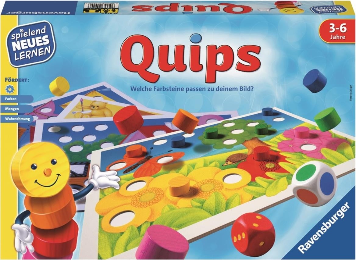 Quips von Ravensburger - ein Legespiel zum Lernen von Farben und ersten Mengen Wer schafft es die richtige Anzahl an Steinen aus dem Beutel zu greifen? Wer schafft es die richtige Farbe zu würfeln? Im Baum fehlen drei grüne, im Dach fehlen zwei rote Holzsteine. Jeder Spieler erhält eine Legetafel und muss darauf achten, dass die farbigen Holzsteine auf dem richtigen Feld landen. So werden Farben verglichen und zugeordnet, fehlende Steine abgezählt. Sieger ist, wer als Erster sein Bild mit Farben gefüllt hat. Die Förderschwerpunkte liegen bei diesem Spiel bei den Farben, Mengen und der Wahrnehmung. Inhalt/Ausstattung: 4 Legetafeln, 90 Holzsteine in 6 Farben, 1 Punktwürfel, 1 Farbwürfel, 1 Stoffbeutel Altersempfehlung: 3-6 Jahre Spieldauer: ca. 15 Minuten Spieleranzahl: 2-4 Spieler Achtung! Nicht geeignet für Kinder unter 3 Jahren, aufgrund verschluckbarer Kleinteile. Erstickungsgefahr!