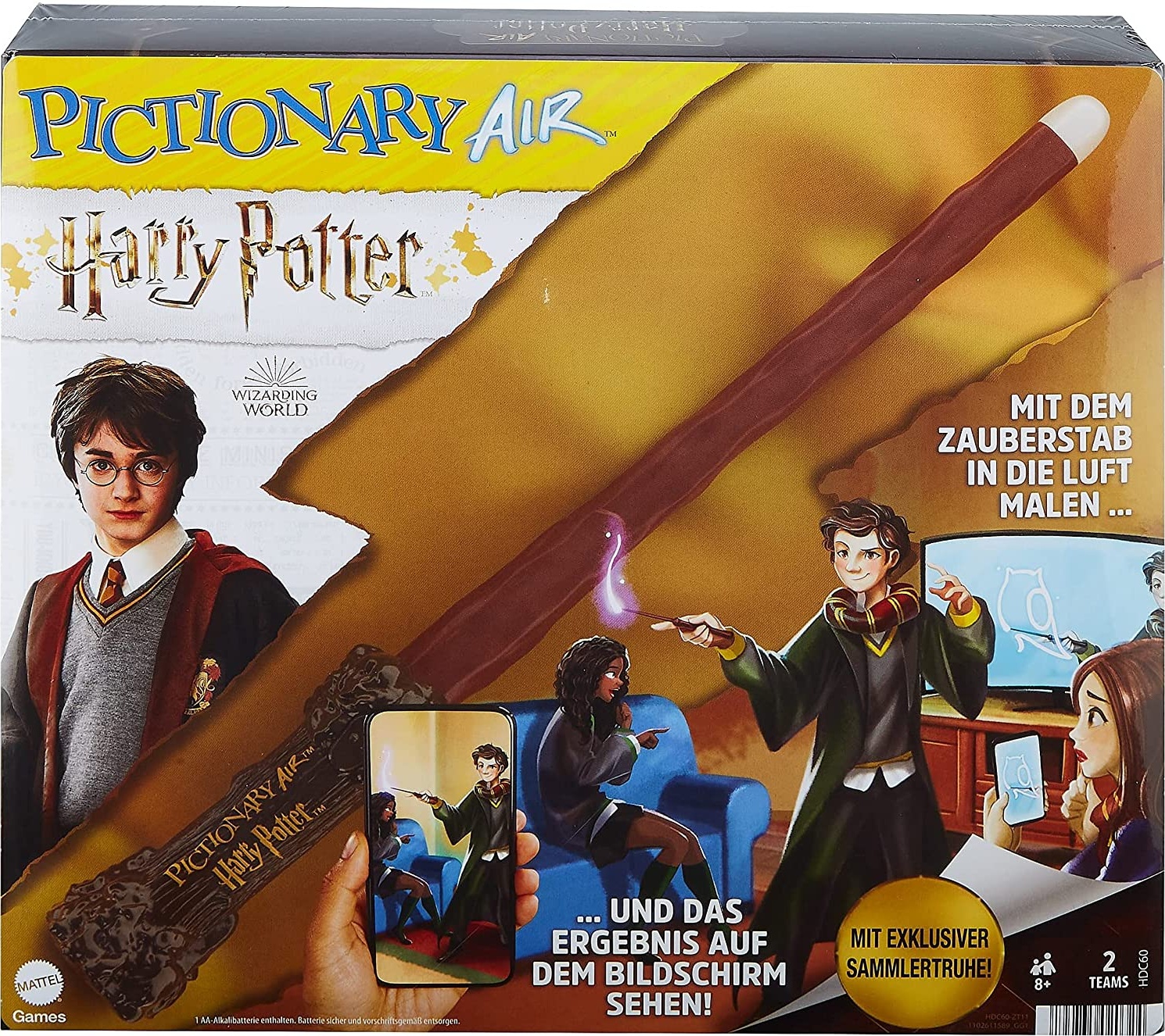 Mattel Games Pictionary Air Harry Potter, Familienspiel, Zeichenspiel Viel Spaß mit der zauberhaften Abwandlung des klassischen Zeichenspiels für die ganze Familie mit Pictionary Air Harry Potter. In die Luft malen und das Bild auf dem Bildschirm sehen mit diesem verzauberten Spiel, das Hexen, Zauberer und Muggel gleichermaßen begeistern wird! Jedes Team tritt für eines der Häuser von Hogwarts an (Gryffindor, Hufflepuff, Slytherin oder Ravenclaw). Die Box für Sammler enthält ein Pictionary Air Stift in der Form von Harry Potters berühmten Zauberstab, ein Kartenhalter, der von Harrys Koffer inspiriert ist und 112 doppelseitig bedruckte Begriffskarten mit Begriffen aus der magischen Welt. Einfach die kostenlose Pictionary Air App auf ein Smartphone oder Tablet herunterladen (Es kann sein, dass Kosten für die Nutzung des Internets anfallen). Zum Spielen sind ein kompatibles i OS- oder Android-Smart-Gerät und die App erforderlich. Nach dem Öffnen der App wird die Kamera auf den zeichnenden Spieler gerichtet, der dann zusammen mit seiner Zeichnung auf dem Bildschirm zu sehen ist. Noch magischer wird es, wenn die Bilder mit Apple TV, Chromecast oder einem anderen Streaming-Gerät auf den Fernseher übertragen werden. Kompatibles Streaming-Gerät zur Übertragung des Spiels auf einen Fernseher erforderlich. Kompatible Geräte können jederzeit und ohne vorherige Ankündigung geändert werden. Auf der Hilfeseite von Pictionary Air (www. pictionary. com/support) können aktualisierte Informationen zu kompatiblen Geräten und andere Informationen geprüft werden. Dieses Spiel für die ganze Familie ist fantastisch für Spieleabende und Partys. Abweichungen in Farbe und Gestaltung vorbehalten. Jedes Team tritt für eines der Häuser von Hogwarts an und bringt Bewegung ins Spiel mit dem Pictionary Air Harry Potter, einer magischen Abwandlung des klassischen Zeichenspiels. Mit Harrys Zauberstab werden die Harry Potter Begriffskarten, die von der magischen Welt inspiriert sind, in die Luft gezeichnet!Die Spieler zeichnen abwechselnd in die Luft und interagieren mit den Bildern, während ihre Teammitglieder die Bilder erraten!Einfach die kostenlose Pictionary Air App herunterladen und den jeweiligen Spieler zusammen mit seiner Zeichnung auf dem Bildschirm sehen. Die Spieler können das Spiel zuhause mit Apple TV, Chromecast oder einem kompatiblen streaming-fähigen Gerät auf den Fernseher übertragen. Dafür ist ein kompatibles streaming-fähiges Gerät erforderlich. Die Gerätekompatibilität und weitere Informationen k Pictionary Air Harry Potter ist perfekt für einen magischen Spieleabend mit der Familie! Bei Sortimenten und Großpackungen gilt der angegebene Preis pro Stück. Eine Auswahl ist nur bedingt möglich!