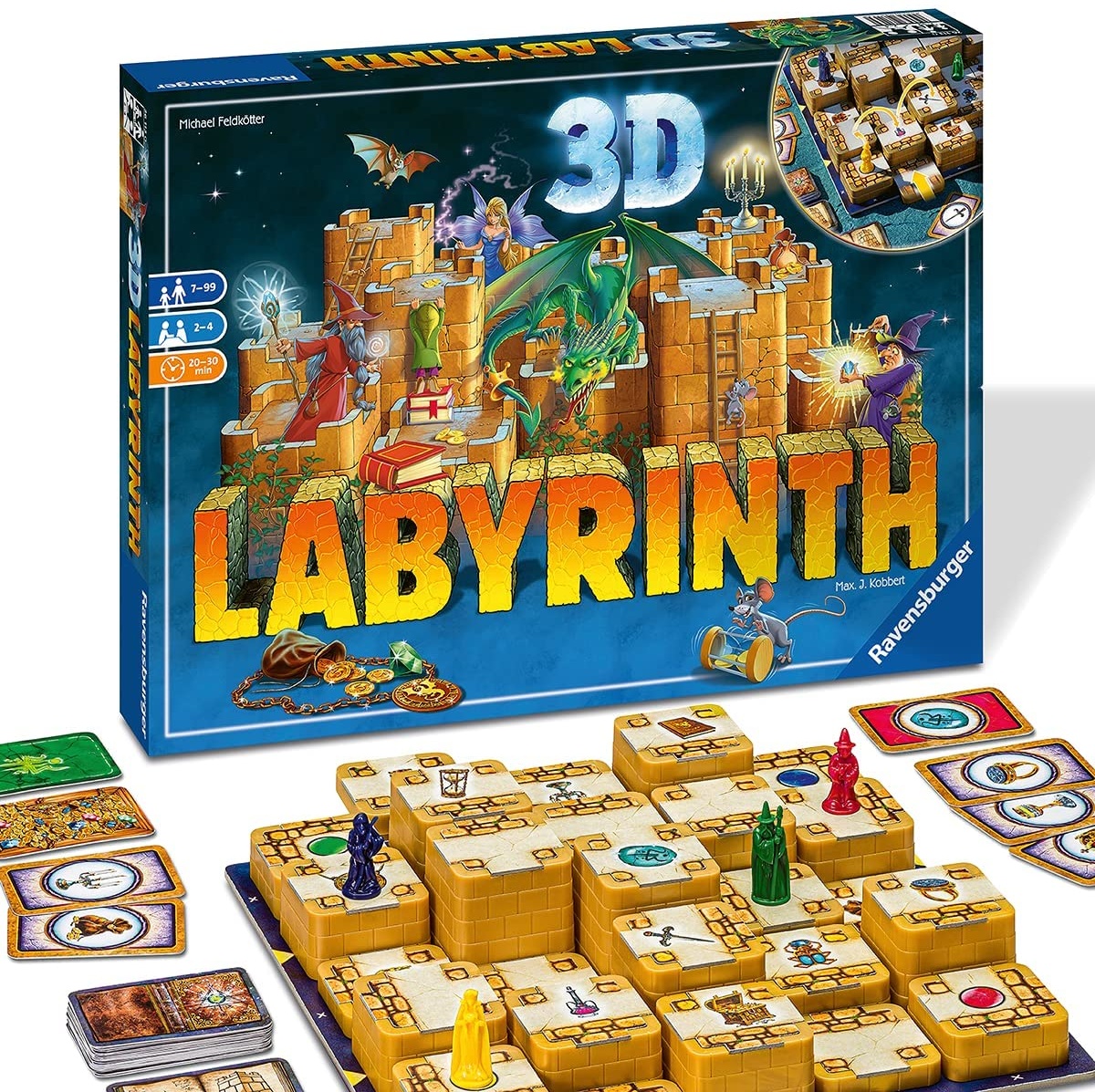 Ravensburger Familienspiel 3D Labyrinth - wer am schnellsten seine Schätze sammelt, gewinnt den schlauen Schiebespaß in 3D! Für alle Fans des beliebten Ravensburger Spiels "Das verrückte Labyrinth" geht es nun hoch hinaus. Wie beim Klassiker müssen Schätze gefunden werden, die man durch geschicktes Verschieben der Turmreihen und cleveres Ziehen der Spielfigur erreicht. Aber im 3D Labyrinth dürfen auch Türme erklommen werden, die maximal 1 Stufe höher oder niedriger sind, als der Turm, von dem die eigene Figur gerade kommt. Es sei denn, man ist im Besitz von Zauberkarten, mit denen man die Stufenregel austricksen kann. Glück und Strategie helfen dabei, dieses Spiel zu gewinnen. Wer als Erster alle seine Schätze gefunden hat und mindestens einmal im Spiel zum Runenstein in der Spielplanmitte gezogen ist, ist der Sieger. Anzahl Spieler: 2 - 4 Spieldauer: ca. 20 - 30 Minuten Packungsinhalt: 1 Spielplan, 26 Türme, 12 Schatzkarten, 4 Runenkarten, 24 Zauberkarten, 4 Spielfiguren (Hexe, Magier, Prinzessin und Zauberlehrling) Maße der Verpackung: 37 x 27 x 6 cm Altersempfehlung: ab 7 Jahre Achtung! Nicht für Kinder unter 3 Jahren geeignet. Verschluckbare Kleinteile! Erstickungsgefahr!