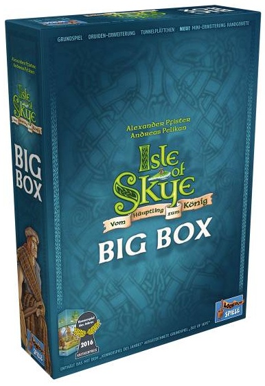 | Beschreibung | Der moderne Legespiel-Klassiker als Big Box! Die Isle of Skye Big Box enthält das preisgekrönte Grundspiel Isle of Skye (Kennerspiel des Jahres 2016), die Erweiterung Druiden sowie zusätzliche Wertungs- und Tunnelplättchen. Neu hinzu kommt die Mini-Erweiterung Randgebiete. Im Spiel verkörpern die Spieler je einen Anführer der fünf traditionellen schottischen Clans. Die Spieler erschaffen ihr eigenes kleines Reich, um damit die benötigten Siegpunkte zu erringen. Aber in jeder Partie sind nur vier der enthaltenen 24 Wertungskarten im Spiel. Dadurch wird jede Partie anders und erfordert unterschiedliche Taktiken und Strategien. |