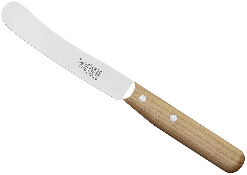 Das WINDMÜHLEN Frühstücksmesser Carbon Buckels ist das ideale Werkzeug zum Schneiden von Brot, Backwaren, Käse und Hartwurst sowie zum Streichen. Die Klinge aus hochwertigem Kohlenstoffstahl ist nicht rostfrei und bietet eine feingepließte Oberfläche für präzises Schneiden. Der ovale Griff aus Kirschbaumholz sorgt für eine angenehme Handhabung. Mit einer Klingenlänge von ca. 118 mm und einer Gesamtlänge von ca. 220 mm ist dieses Messer vielseitig einsetzbar. **Highlights** - Hochwertige Klinge aus Kohlenstoffstahl - Ovaler Griff aus Kirschbaumholz für angenehme Handhabung - Vielseitig einsetzbar für verschiedene Lebensmittel - Feingepließte Oberfläche für präzises Schneiden - Geeignet zum Schneiden in der Hand und auf dem Brett **Produkteigenschaften** - Material: Klinge aus hochwertigem Kohlenstoffstahl, Griff aus Kirschbaumholz, Nieten aus Aluminium - Klingenlänge: ca. 118 mm / 4,5 Zoll - Gesamtlänge: ca. 220 mm - Farbe: kirschbaumholzfarben - Gewicht: 0,046 kg **Lieferumfang** - 1x WINDMÜHLEN Frühstücksmesser Carbon Buckels - Ausschluss von Zubehör und weiteren Produkten