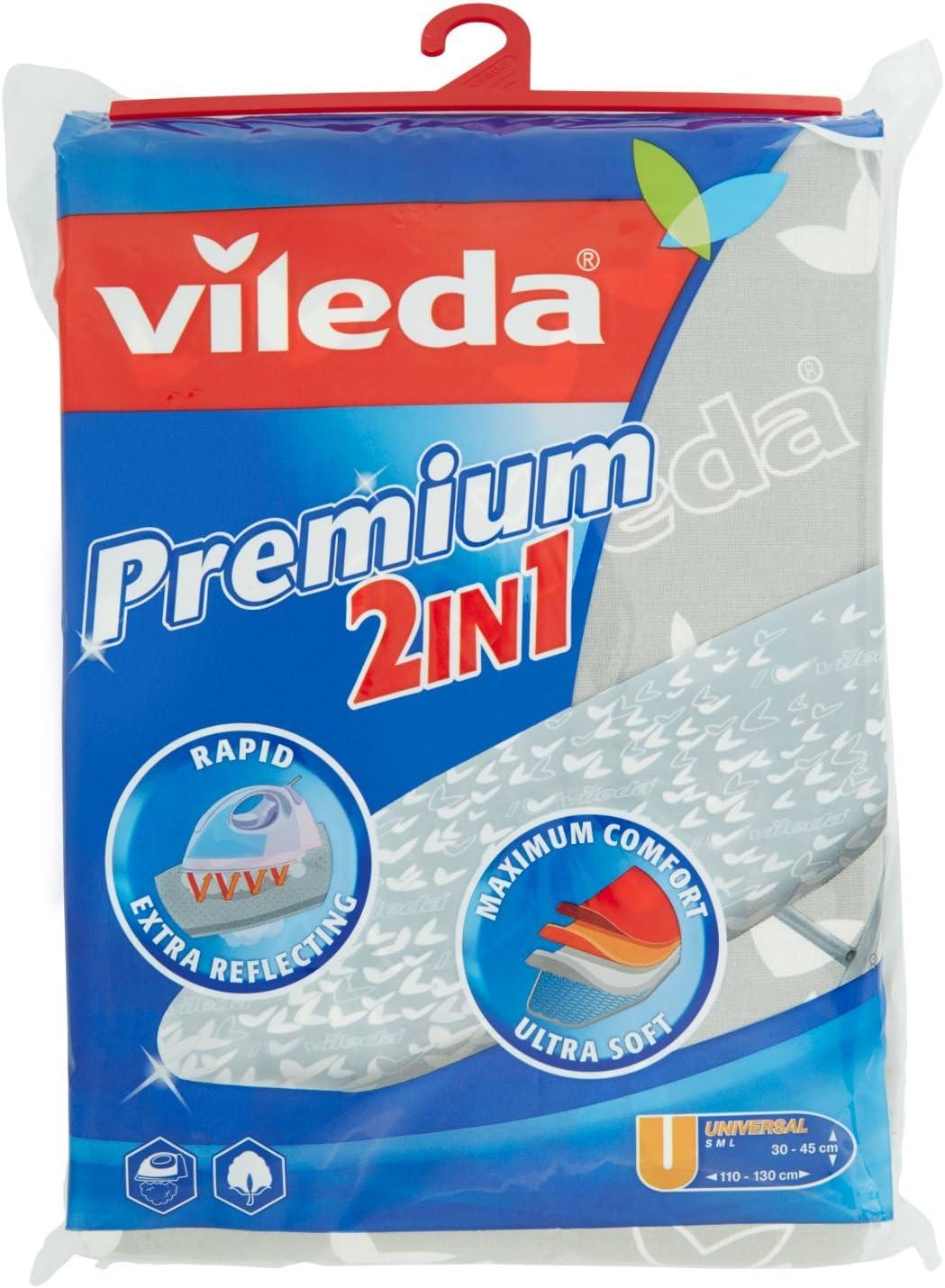 Der VILEDA Bügeltischbezug Premium 2in1 ist die ideale Lösung für effizientes Bügeln. Mit einer universellen Passform für Bügeloberflächen von 30-45 cm Breite und 110-130 cm Länge, lässt sich der Bezug dank des Quick-Fix Systems und des innovativen Eckspannbezugs einfach und passgenau aufziehen. Die metallisierte, hitzereflektierende Oberfläche verkürzt die Bügelzeit erheblich, während die 3 Lagen maximalen Komfort bieten und ein Durchdrücken des Gitters verhindern. **Highlights** - Quick-Fix System mit innovativem Eckspannbezug für passgenaues Aufziehen - Kinderleichter Austausch dank Tunnelzug und Zugstopper - Universelle Passform für Bügeloberflächen von 30-45 cm Breite und 110-130 cm Länge - Metallisierte, hitzereflektierende Oberfläche für deutlich kürzere Bügelzeit - 3 Lagen für maximalen Bügelkomfort: kein Durchdrücken des Gitters **Produkteigenschaften** - Material: 100% Baumwolle (Stoff), 100% Polyurethan (Schaum), 100% Polyester (Molton) - Maße: Länge 110-130 cm / Breite 30-45 cm - Hohe Qualitätsanmutung - Weiche Oberfläche für leichtes Bügeln - Universalgröße, passt auf alle gängigen Bügeltische