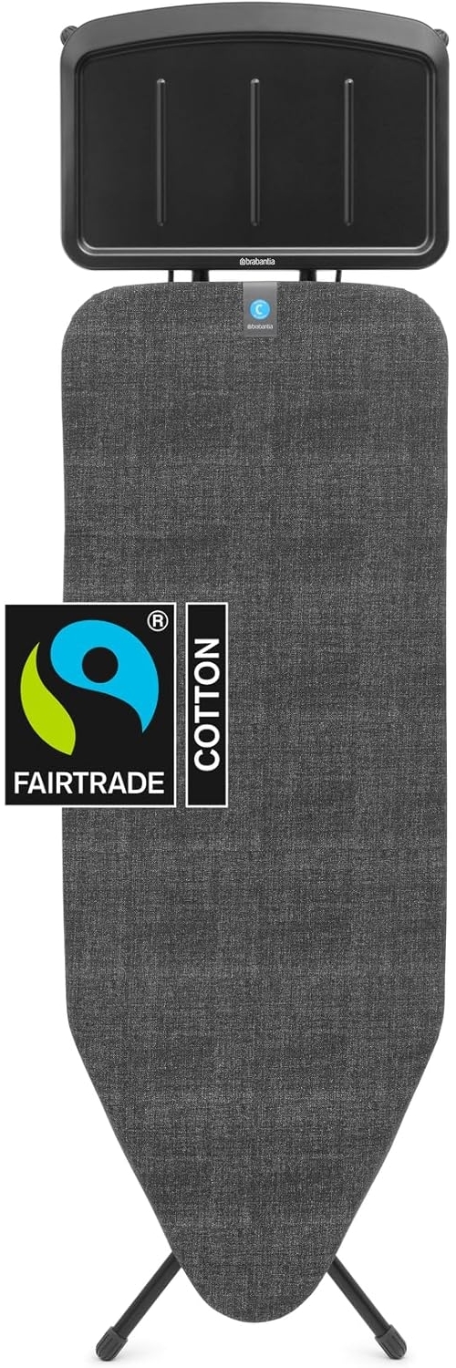 Das Brabantia Bügelbrett C bietet Ihnen mit einer großzügigen Bügelfläche von 124x45 cm optimalen Komfort beim Bügeln. Die stabile Dampfstationsablage aus Stahl sorgt dafür, dass Ihr Dampfbügeleisen sicher platziert werden kann. Das verstellbare Gestell garantiert eine hohe Stabilität. Zudem unterstützt der Bezug aus 100 % Fairtrade-Baumwolle einen fairen Anbau und Handel. **Highlights** - Großzügige Bügelfläche von 124x45 cm für effizientes Bügeln - Stabile Dampfstationsablage aus Stahl für sicheren Halt des Dampfbügeleisens - Verstellbares, stabiles Gestell für individuelle Anpassung - Bezug aus 100 % Fairtrade-Baumwolle unterstützt fairen Anbau und Handel - Bekannte Brabantia-Qualität für langlebige Nutzung **Produkteigenschaften** - Maße (BxT): 124x45 cm - Fairtrade-zertifiziert - Robuste Konstruktion für hohe Stabilität