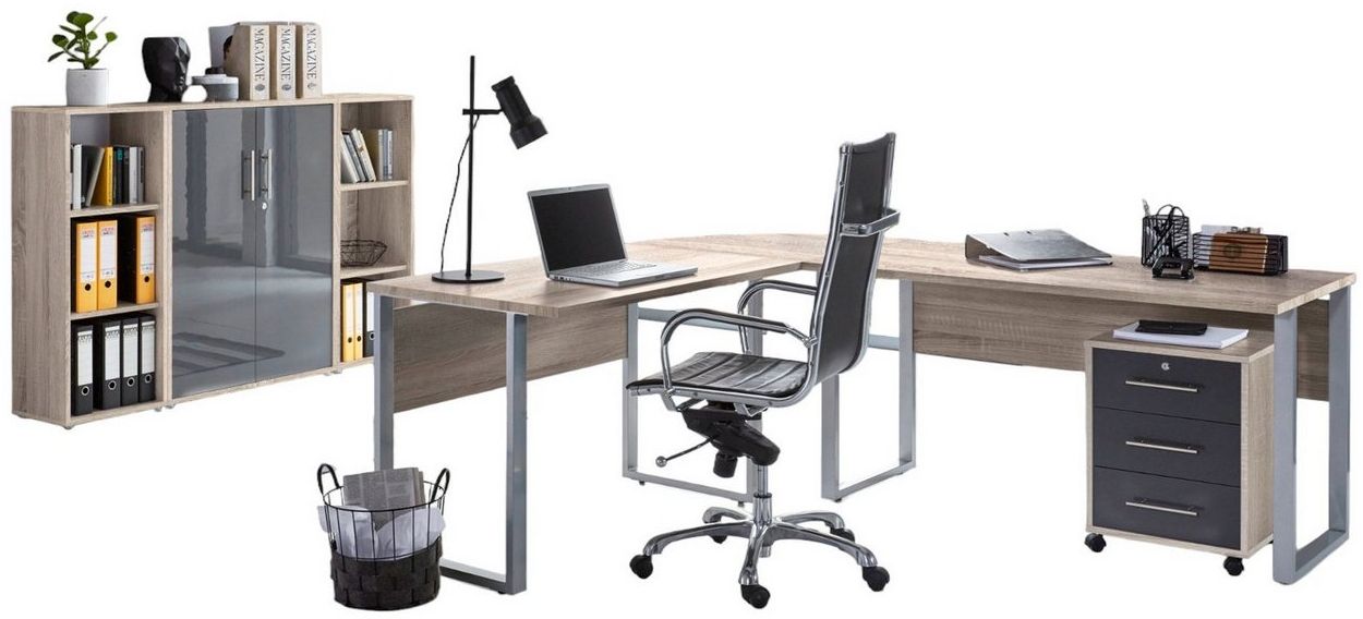| Name | moebel-dich-auf Büromöbel-Set TABOR PRO Set 2, (Aktenschränke abschließbar, 5-tlg, Set 2 Winkelschreibtisch + Rollcontainer + Highboard + Aktenregale), Hochglanz lackierte Fronten, Metallgriffe |