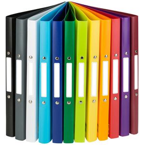 Ringbücher aus wasser- und schmutzabweisendem Kunststoff 2-Rund-Ring Mechanik zum Abheften von ca. 100 Blatt A4-Papier Aufklebbare Rückenschilder zur individuellen Beschriftung Mit farbigem Innenspiegel ---------------------------------------- Merkmale: Format: A4 Ringmechanik: 2 Ringe Ringdurchmesser: 16 mm Material: Kunststoff Farbe: farbig sortiert ---------------------------------------- weitere Produktinformationen: Rückenbreite: 2cm Fassungsvermögen: 100 Blatt Rückenschild: geklebt Inhalt: 12 Stück