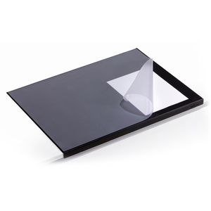 Transparente Abdeckung zum Unterlegen von z.B. Notizen Aufklappbare Vollsichtauflage aus Kunststoff Rutschfeste Rückseite aus Schaumgumi Selbstklebende Fixierstreifen für perfekten Sitz an Tischkanten Made in Germany ---------------------------------------- Merkmale: Material: Kunststoff Farbe: schwarz Maße: 65 x 50 cm Ausführung: blanko, mit Kantenschutz, mit Sichtplatte geeignet für: Büro, Schule