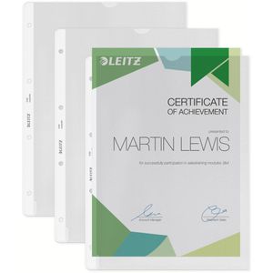 Oben und an der Lochseite offene Prospekthülle aus Polypropylen (PP) Mit Papiereinlage - Blatt Papier pro Hülle zur Reduzierung statischer Aufladung Dokumentenecht - keine Übertragung von Druckerfarbe Mit 4-fach-Lochung, Daumenausschnitt und reißfester Lochrandverstärkung ---------------------------------------- Merkmale: Format: A4 Oberfläche: genarbt Öffnung: oben und Lochseite Folienstärke: 0,13 mm ---------------------------------------- weitere Produktinformationen: Farbe: transparent Material: Polypropylen Inhalt: 100 Stück