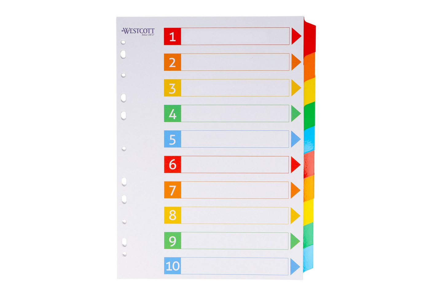 • Das WESTCOTT Aktenordner Register für DIN A4 Ordner bietet mit seinen 10 beschriftbaren Tabs in fünf verschiedenen Farben eine effiziente Möglichkeit, Ihre Dokumente zu organisieren