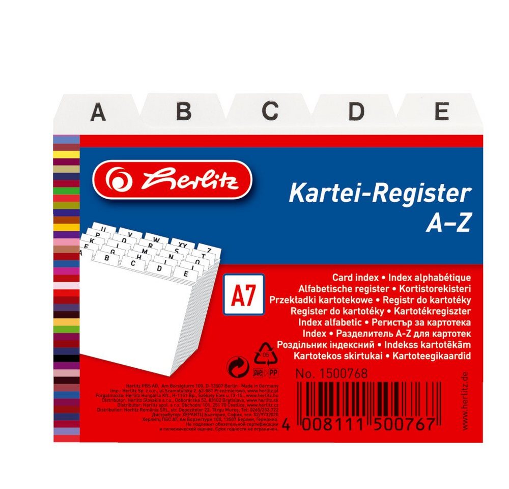 • Dieser Aktenordner von Herlitz enthält Karteiregister von A bis Z im DIN A7 Format