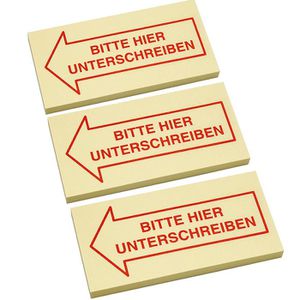 3 x 50 Haftstreifen im Format 35 x 70 mm Mit Schriftzug "BITTE HIER UNTERSCHREIBEN" als Hinweis Selbstklebend, rückstandsfrei wiederablösbar und beschriftbar ---------------------------------------- Merkmale: Eigenschaft: beschriftbar Material: Papier Ausführung: Bitte hier Unterschreiben Farbe: gelb ---------------------------------------- weitere Produktinformationen: Blattanzahl: 3 x 50 Streifen Maße: 35 x 70 mm (BxL)