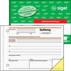 Selbstdurchschreibender Quittungsblock in A6 quer Speziell für Kleinunternehmer, mit Hinweis auf § 19 UStG 2x 30 Blatt - 1. Blatt weiß, 2. Blatt gelb, 2-fach gelocht und perforiert Fortlaufende Nummerierung und stabile Sicherheits-Bindung Mit Sicherheitsdruck - fälschungssicherer Dokumentendruck ---------------------------------------- Merkmale: Ausführung: selbstdurchschreibend Mehrwertsteuer: ohne MwSt., für Kleinunternehmer Blattanzahl: 2 x 30 Blatt ---------------------------------------- weitere Produktinformationen: Format: A6 quer green-Aspekt: aus nachwachsenden Rohstoffen Made in Germany