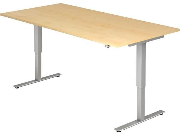 Schreibtisch XMST2E, 200 x 100 cm Platte: Ahorn, 25 mm dick, 2 mm ABS-Kante Rechteckform T-Fuß Gestell in Silber, mit Tastschalter Arbeitshöhe 72 - 119 cm elektrisch stufenlos höhenverstellbar Elektroantrieb 1-stufig, 2 Motoren Tragkraft 80 kg dynamisch, 120 kg statisch Anlieferzustand: zerlegt, einfache Montage