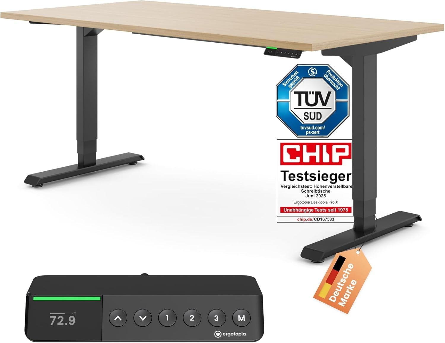 Der elektrisch höhenverstellbare Schreibtisch Desktopia Pro X bietet Ihnen Leistungsfähigkeit und Gesundheit auf Knopfdruck. Mit seiner exakten Höhenanzeige und der praktischen Memory-Funktion mit 9 Speicherplätzen können Sie Ihre bevorzugten Höheneinstellungen speichern und jederzeit abrufen. Die starken und zuverlässigen Motoren bewegen den Tisch sanft und sicher, mit einer dynamischen Belastbarkeit von bis zu 80 kg. Empfohlen von Physiotherapeuten, Professoren und Rückenexperten, ist der Desktopia Pro X der ideale Schreibtisch für ergonomisches Arbeiten. **Highlights** - Sehr hochwertige Technik - Edles LED-Display mit exakter Höhenanzeige und Memoryfunktion mit 9 Speicherplätzen - Starke und zuverlässige Motoren mit Kollisionsschutz und sanftem Start/Stopp - Empfohlen von Physiotherapeuten, Professoren und Rückenexperten - Arbeitshöhe von 62,3-127 cm **Produkteigenschaften** - Farbe (Tischplatte): Ahorn - Maße: 120x80 cm (B x T), 160x80 cm (B x T), 180x80 cm (B x T) - Einheitsgestell geeignet für Tischplattengrößen von 120-200 cm Breite - Antrieb: Elektroantrieb, 2 zuverlässige Motoren, 38 mm pro Sekunde - Nutzlast: 80 kg dynamisch (bei Bewegung) / 100 kg statisch (bei Stillstand) - Gestellfarbe: Schwarz (RAL 9005) **Lieferumfang** - Elektrisch höhenverstellbarer Schreibtisch Desktopia Pro X - Tischplatte in gewählter Farbe und Größe - Tischgestell in gewählter Farbe - Bedienungsanleitung - 7 Jahre Garantie