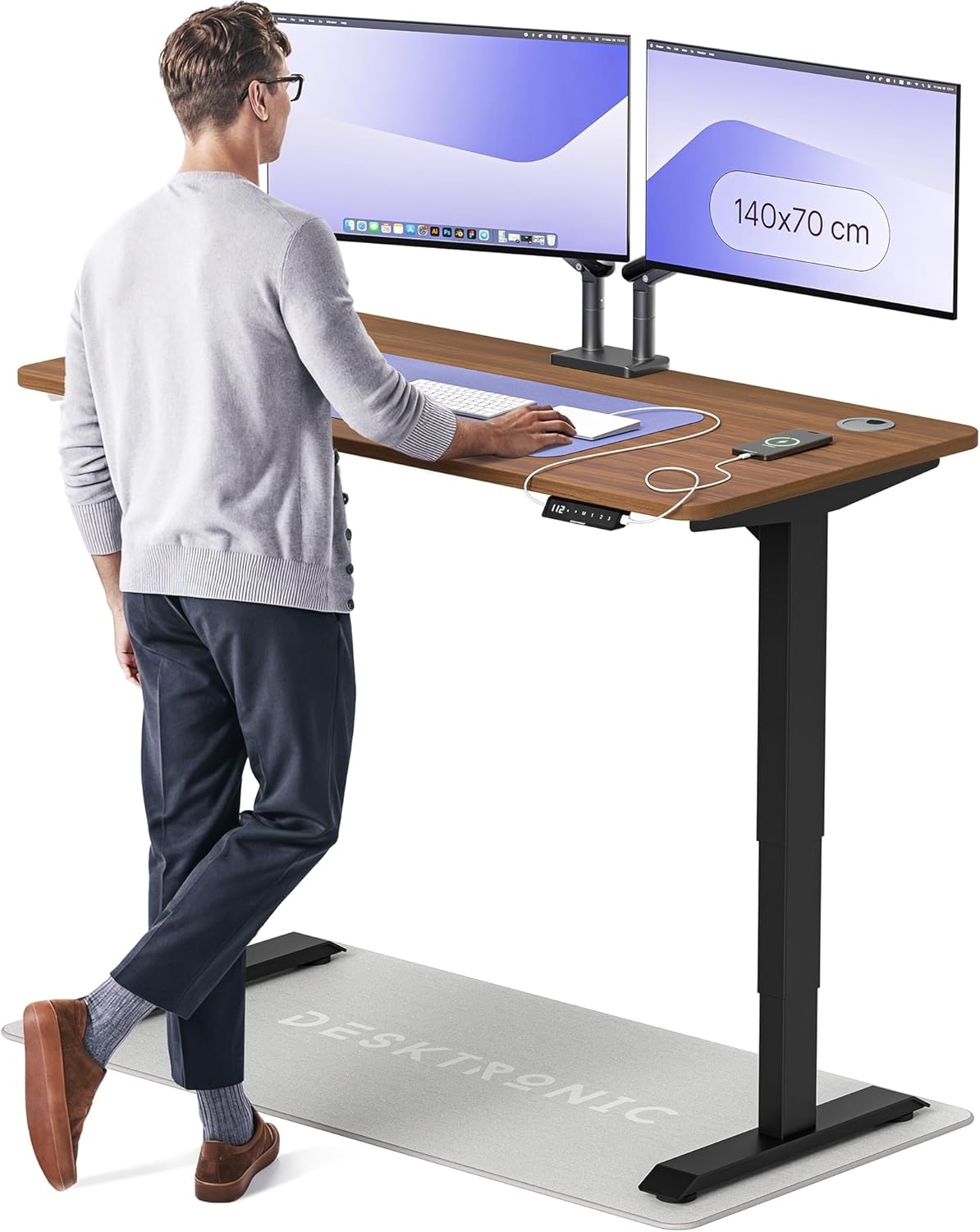 Höhenverstellbarer Schreibtisch von Desktronic in Schwarz und Nussbaum mit den Abmessungen 140 x 70 cm. Der elektrisch verstellbare Tisch verfügt über einen flüsterleisen Dual-Motor, der in nur 12 Sekunden die gewünschte Höhe erreicht. Mit einer Tragfähigkeit von bis zu 160 kg und einer robusten Stahlkonstruktion bietet er Stabilität und Sicherheit. Der benutzerfreundliche Touchscreen-Controller und das integrierte Kabelmanagement machen ihn ideal für Ihr Homeoffice. **Highlights** - Flüsterleiser Hochleistungs-Dual-Motor für leises Arbeiten - Soft-Start und Soft-Stop-Aktivierung für sanfte Höhenverstellung - Hohe Tragfähigkeit von bis zu 160 kg - Einfache Montage mit mehrsprachiger Anleitung - Integrierte USB- und USB-C-Ladestellen **Produkteigenschaften** - Abmessungen: 140 x 70 cm - Schreibtischgestell aus Stahl: 90 mm x 60 mm x 3 mm - 3-stufige Verstellsäule für Menschen aller Größen - Kinderfreundliche abgerundete Ecken - 2 Kabeldurchführungen für ordentliches Kabelmanagement **Lieferumfang** - Höhenverstellbarer Schreibtisch - Mehrsprachige Anleitung - Werkzeuge zur Montage