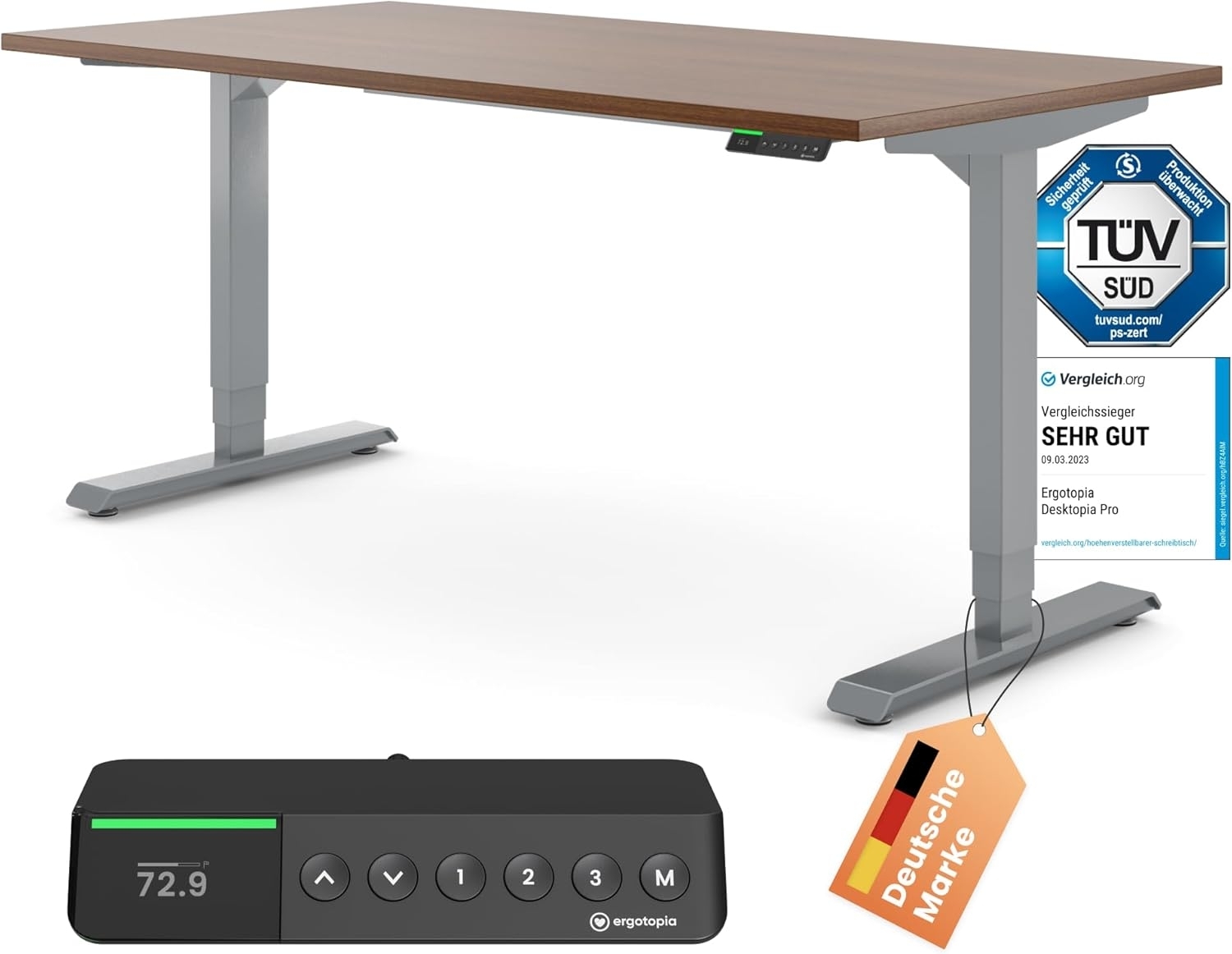 | Name | Desktopia Pro X - Elektrisch höhenverstellbarer Schreibtisch / Ergonomischer Tisch mit Memory-Funktion, Nussbaum, Gestell Grau, 180x80 cm |