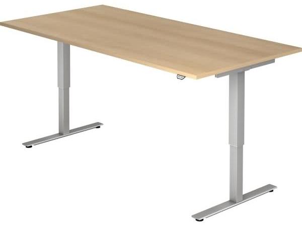Schreibtisch XMST2E, 200 x 100 cm Platte: Eiche, 25 mm dick, 2 mm ABS-Kante Rechteckform T-Fuß Gestell in Silber, mit Tastschalter Arbeitshöhe 72 - 119 cm elektrisch stufenlos höhenverstellbar Elektroantrieb 1-stufig, 2 Motoren Tragkraft 80 kg dynamisch, 120 kg statisch Anlieferzustand: zerlegt, einfache Montage