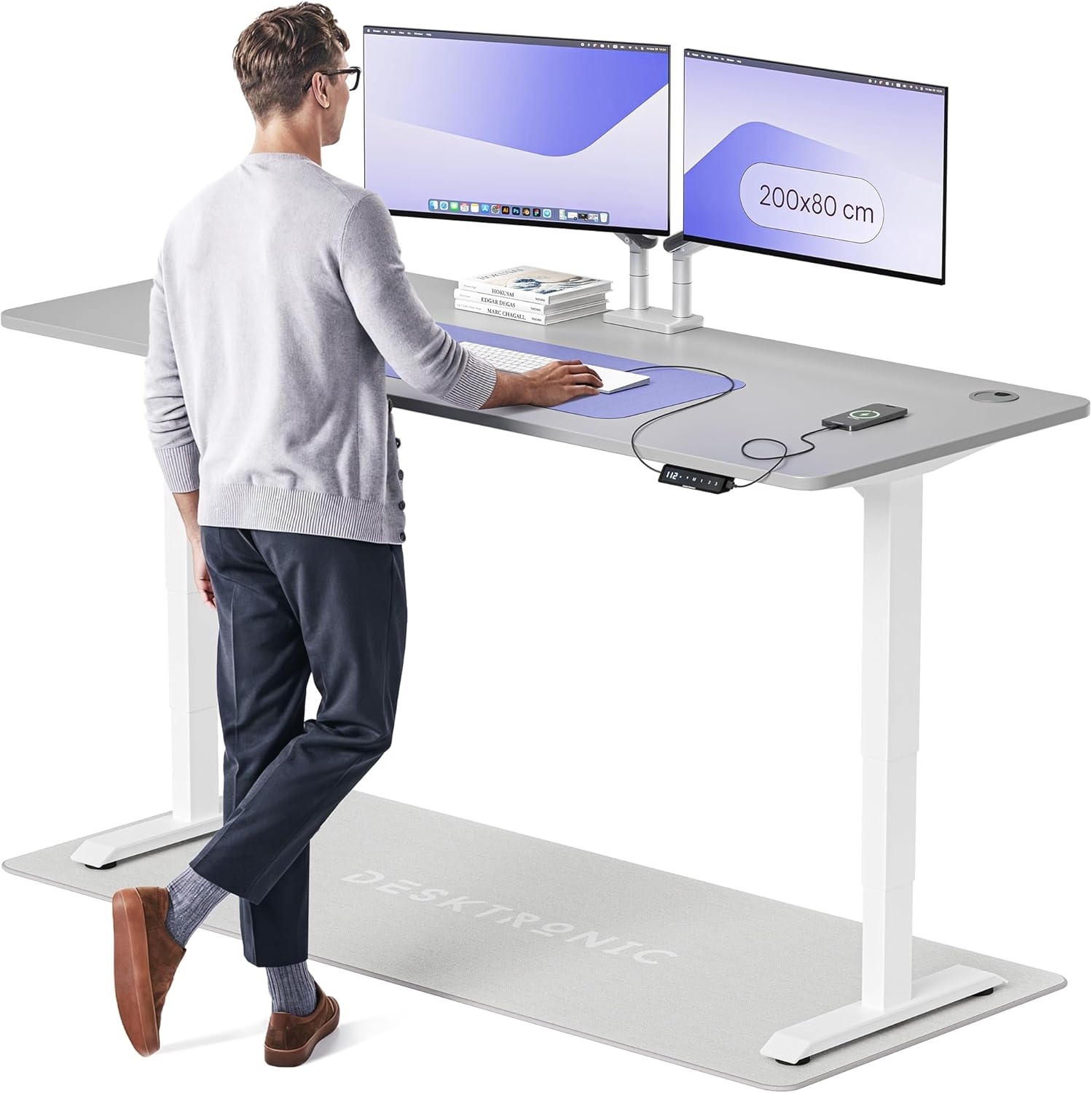 Höhenverstellbarer Schreibtisch von Desktronic in Weiß und Grau (200 x 80 cm) bietet Ihnen eine flexible Arbeitsumgebung. Mit einem flüsterleisen Dual-Motor erreichen Sie in nur 12 Sekunden die gewünschte Höhe. Der Schreibtisch hat eine Tragfähigkeit von bis zu 160 kg und ein stabiles Stahlgestell. Der integrierte Touchscreen-Controller ermöglicht eine einfache Bedienung und bietet drei speicherbare Einstellungen. **Highlights** - Flüsterleiser Hochleistungs-Dualmotor für präzise Höhenverstellung - Tragfähigkeit von bis zu 160 kg für zusätzliche Stabilität - Einfache Montage mit mehrsprachiger Anleitung - Touchscreen-Controller mit drei einstellbaren Speicheroptionen - Integrierte USB- und USB-C-Ladestellen für praktisches Kabelmanagement **Produkteigenschaften** - Abmessungen: 200 x 80 cm - Gestell aus Stahl: 90 mm x 60 mm x 3 mm - Höhenverstellbare 3-stufige Säule - Kinderfreundliche abgerundete Ecken - Schnelle Verstellung in nur 12 Sekunden **Lieferumfang** - Höhenverstellbarer Schreibtisch - Montagewerkzeuge - Mehrsprachige Anleitung